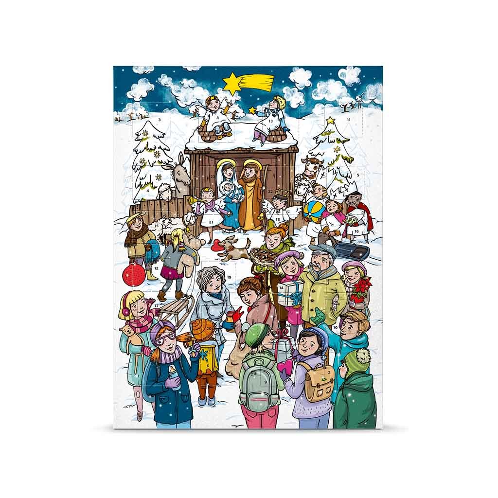 Krásný fairtradový kalendář s 24 motivy z bio mléčné čokolády s 37 % kakaa, příběhem o narození Krista na dvířkách a s vystřihovánkou betlému jako bonus.