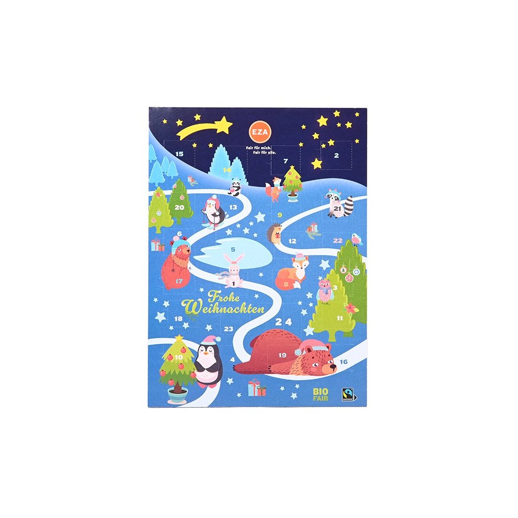 Bio mléčná čokoláda v tomto kalendáři se obešla bez emulgátorů a samozřejmě i bez náhražek a cizích tuků. Pouze skutečná bio mléčná čokoláda s certifikací Fairtrade, která mimo jiné zakazuje dětskou práci a nabízí pěstitelům důstojnou mzdu za jejich produkci.