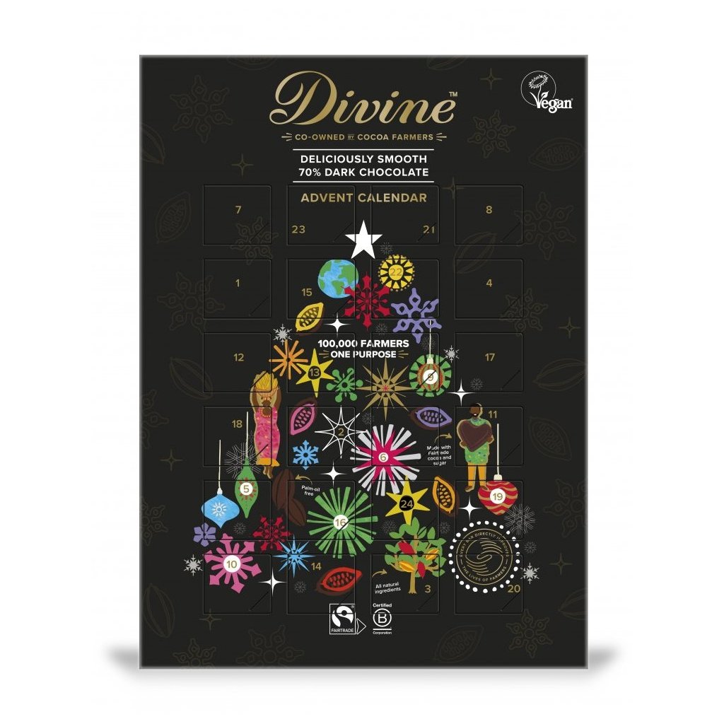 Hořká čokoláda v tomto kalendáři se sice zřekla cizích tuků a náhražek, ale bez lecitinu, i když slunečnicového, se neobešla, jak je u Divine zvykem. Samozřejmostí je certifikace Fairtrade, která mimo jiné zakazuje dětskou práci a nabízí pěstitelům důstojnou mzdu za jejich produkci. Na vnitřní straně všech dvířek jsou krátké anglicky psané zprávičky ze světa zemědělství, čokolády a životního prostředí. V zadní straně kalendáře je připravené kartónové očko k zavěšení na zeď.