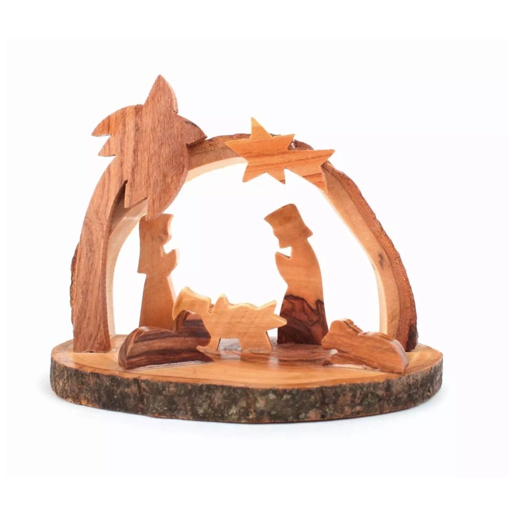 Malý betlém ručně vyřezaný z cenného olivového dřeva ve staré Palestině. Dřevo po obvodu má ponechanou svou kůru, což působí přírodně a připomíná stáří olivového dřeva. Široká plochá základna umožňuje stabilní postavení na jakoukoli podložku.